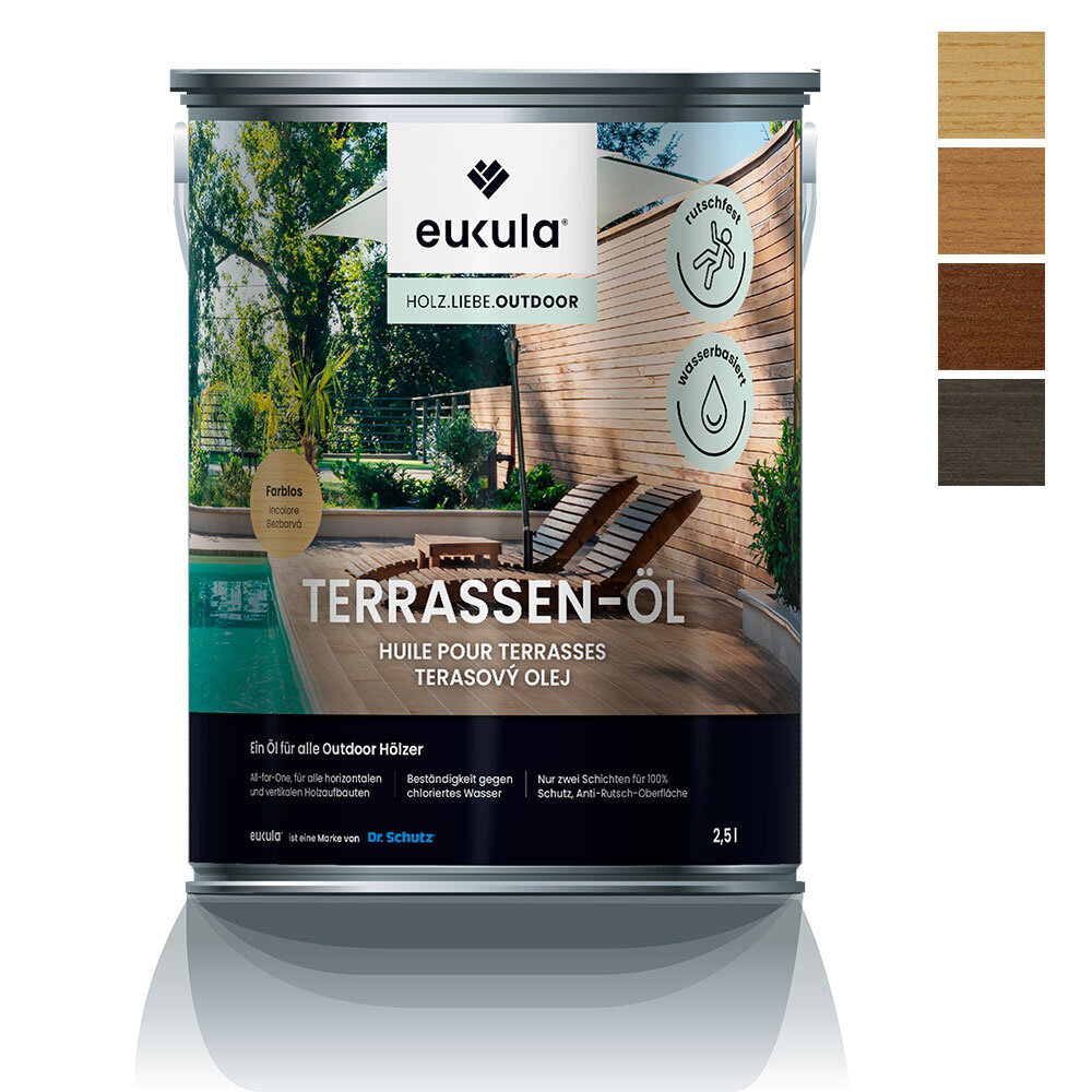 DECK OIL protects and beautifies all horizontal and vertical, non-dimensional and limited-dimensional exterior wood surfaces around the deck, e.g., deck boards, pool surrounds, garden furniture, garden and privacy fences, and much more. The good transparency and ultra-matt surface emphasize the natural look of the wood. The surface also has a natural feel, which also has a slip-resistant effect.